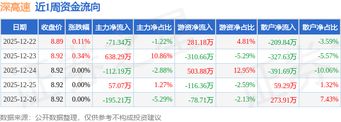 资金流向数据方面,本周深高速主力资金合计净流入316.62万元,游资资金合计净流入279.34万元,散户资金合计净流出595.96万元。本周资金流向一览见下表: