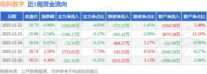资金流向数据方面,本周电科数字主力资金合计净流出2359.52万元,游资资金合计净流入2586.11万元,散户资金合计净流出226.59万元。本周资金流向一览见下表: