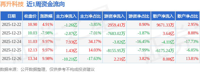 资金流向数据方面,本周再升科技主力资金合计净流出4.99亿元,游资资金合计净流出2.89亿元,散户资金合计净流入7.88亿元。本周资金流向一览见下表: