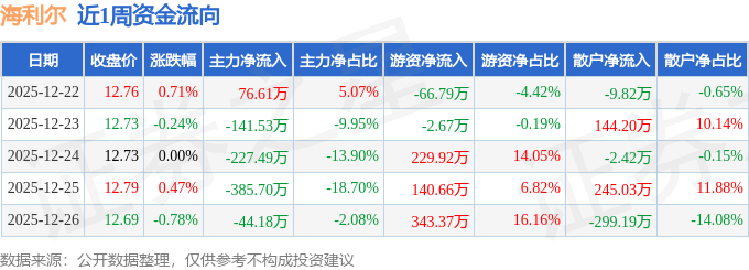 沪深股通持股方面,截止2025年12月26日收盘,海利尔沪股通持股数为109.75万股,占流通股比为32.0%。