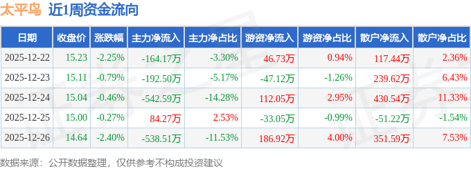 资金流向数据方面,本周太平鸟主力资金合计净流出1353.5万元,游资资金合计净流入265.53万元,散户资金合计净流入1087.98万元。本周资金流向一览见下表: