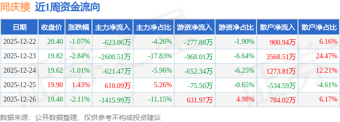 资金流向数据方面,本周同庆楼主力资金合计净流出4650.95万元,游资资金合计净流出1341.75万元,散户资金合计净流入5992.7万元。本周资金流向一览见下表: