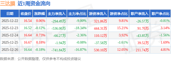 资金流向数据方面,本周三达膜主力资金合计净流出1640.54万元,游资资金合计净流入1368.0万元,散户资金合计净流入272.54万元。本周资金流向一览见下表: