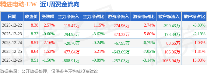 资金流向数据方面,本周精进电动主力资金合计净流出531.44万元,游资资金合计净流出220.39万元,散户资金合计净流入751.83万元。本周资金流向一览见下表: