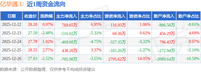 资金流向数据方面,本周亿华通主力资金合计净流出483.85万元,游资资金合计净流入2480.3万元,散户资金合计净流出1996.45万元。本周资金流向一览见下表: