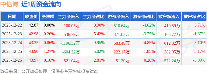 资金流向数据方面,本周中信博主力资金合计净流出642.65万元,游资资金合计净流出24.8万元,散户资金合计净流入667.45万元。本周资金流向一览见下表: