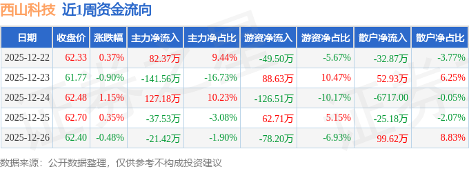 资金流向数据方面,本周西山科技主力资金合计净流入9.04万元,游资资金合计净流出102.87万元,散户资金合计净流入93.82万元。本周资金流向一览见下表: