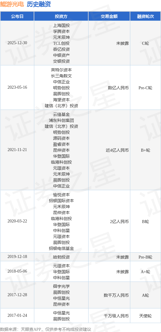 证券之星消息,根据天眼查APP于12月30日公布的信息整理,上海鲲游光电科技有限公司C轮融资,融资额未披露,参与投资的机构包括上海国投,孚腾资本,元禾辰坤,TCL创投,容亿投资,中银资产,交银投资。