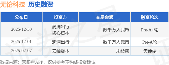 证券之星消息,根据天眼查APP于12月30日公布的信息整理,无论科技(安徽)有限公司Pre-A+轮融资,融资额数千万人民币,参与投资的机构包括滴滴出行,初心资本。