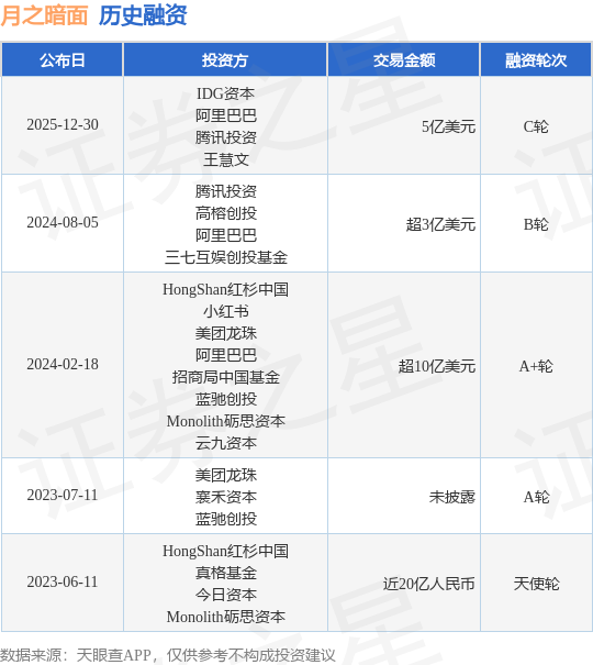 证券之星消息,根据天眼查APP于12月30日公布的信息整理,北京月之暗面科技有限公司C轮融资,融资额5亿美元,参与投资的机构包括IDG资本,阿里巴巴,腾讯投资,王慧文,投后估值43亿美元。