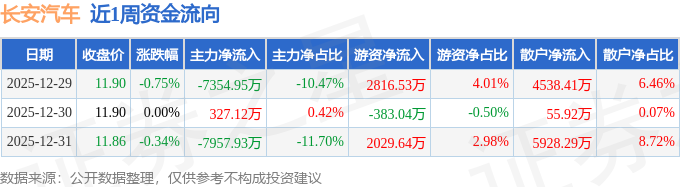 证券之星消息,截至2025年12月31日收盘,长安汽车(000625)报收于11.86元,较上周的11.99元下跌1.08%。本周,长安汽车12月30日盘中最高价报12.05元。12月30日盘中最低价报11.84元。长安汽车当前最新总市值1175.81亿元,在乘用车板块市值排名5/8,在两市A股市值排名147/5181。