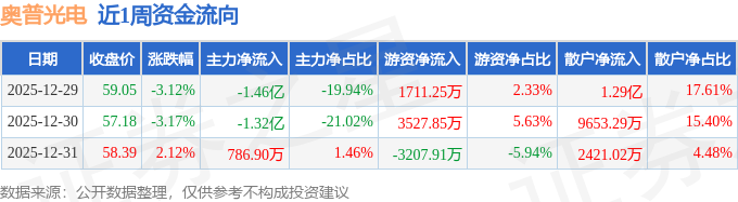 资金流向数据方面,本周奥普光电主力资金合计净流出2.7亿元,游资资金合计净流入2031.19万元,散户资金合计净流入2.5亿元。本周资金流向一览见下表: