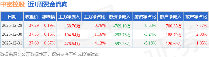 资金流向数据方面,本周中密控股主力资金合计净流入650.23万元,游资资金合计净流出1660.06万元,散户资金合计净流入1009.83万元。本周资金流向一览见下表: