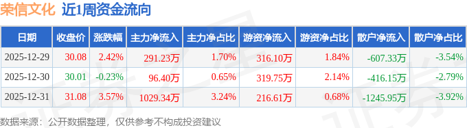 证券之星消息,截至2025年12月31日收盘,荣信文化(301231)报收于31.08元,较上周的29.37元上涨5.82%。本周,荣信文化12月31日盘中最高价报31.79元。12月29日盘中最低价报29.32元。荣信文化当前最新总市值26.23亿元,在出版板块市值排名29/29,在两市A股市值排名4785/5181。