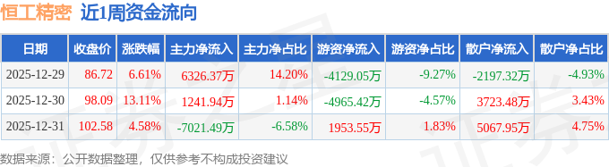 资金流向数据方面,本周恒工精密主力资金合计净流入546.82万元,游资资金合计净流出7140.92万元,散户资金合计净流入6594.11万元。本周资金流向一览见下表: