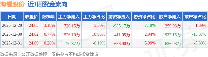 资金流向数据方面,本周海看股份主力资金合计净流入2231.38万元,游资资金合计净流入82.78万元,散户资金合计净流出2314.15万元。本周资金流向一览见下表: