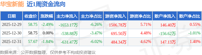 资金流向数据方面,本周华宝新能主力资金合计净流出2823.52万元,游资资金合计净流入2686.61万元,散户资金合计净流入136.91万元。本周资金流向一览见下表: