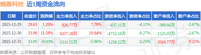 资金流向数据方面,本周熵基科技主力资金合计净流入4772.42万元,游资资金合计净流出6427.51万元,散户资金合计净流入1655.08万元。本周资金流向一览见下表: