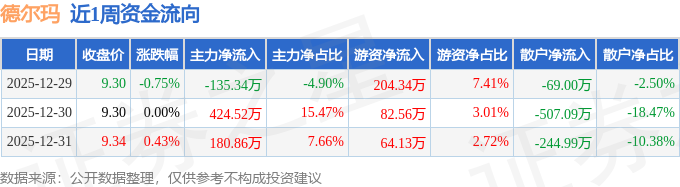 资金流向数据方面,本周德尔玛主力资金合计净流入470.05万元,游资资金合计净流入351.04万元,散户资金合计净流出821.08万元。本周资金流向一览见下表:
