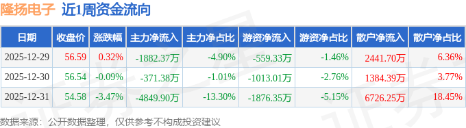 资金流向数据方面,本周隆扬电子主力资金合计净流出7103.65万元,游资资金合计净流出3448.69万元,散户资金合计净流入1.06亿元。本周资金流向一览见下表: