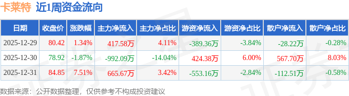 资金流向数据方面,本周卡莱特主力资金合计净流入91.16万元,游资资金合计净流出518.14万元,散户资金合计净流入426.97万元。本周资金流向一览见下表: