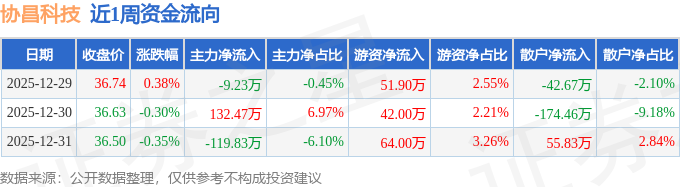 资金流向数据方面,本周协昌科技主力资金合计净流入3.41万元,游资资金合计净流入157.9万元,散户资金合计净流出161.31万元。本周资金流向一览见下表: