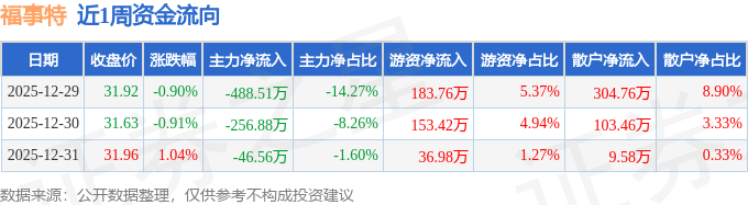 资金流向数据方面,本周福事特主力资金合计净流出791.96万元,游资资金合计净流入374.16万元,散户资金合计净流入417.8万元。本周资金流向一览见下表: