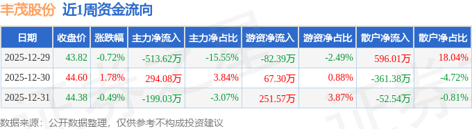 资金流向数据方面,本周丰茂股份主力资金合计净流出418.57万元,游资资金合计净流入236.49万元,散户资金合计净流入182.09万元。本周资金流向一览见下表: