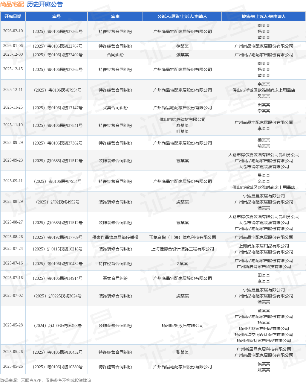 案号:(2025)粤0106民初22767号根据统计,近一年内以广州尚品宅配家居股份有限公司为当事人的历史开庭公告有39则,其中案由为“特许经营合同纠纷”的公告以13则居首,其次为“买卖合同纠纷”有12则,“装饰装修合同纠纷”有8则。历史开庭公告(前20条)如下: