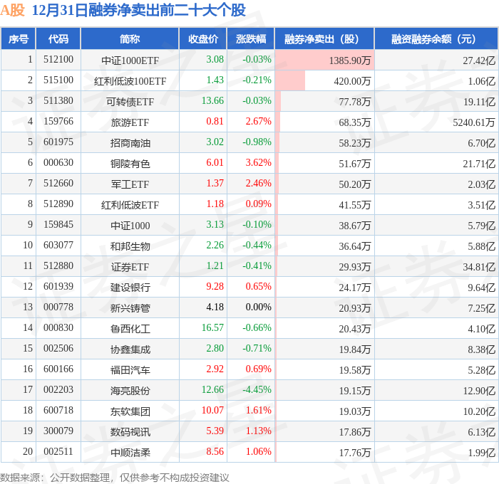 A股融券净卖出前三分别为:中证1000ETF(512100)融券净卖出1385.9万股、红利低波100ETF(515100)融券净卖出420万股、可转债ETF(511380)融券净卖出77.78万股,前20具体见下表: