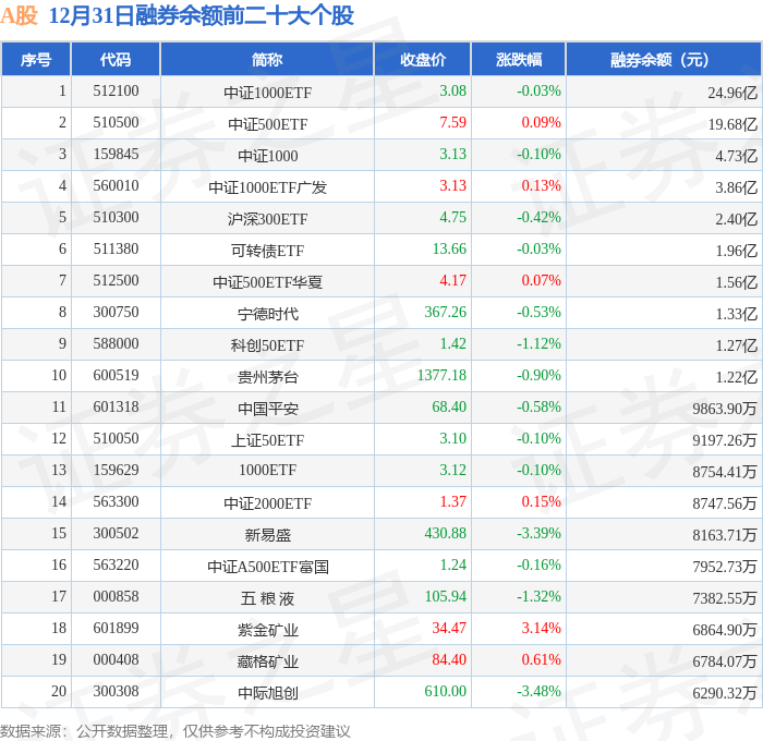 A股融券余额前三分别为:中证1000ETF(512100)融券余额24.96亿元、中证500ETF(510500)融券余额19.68亿元、中证1000(159845)融券余额4.73亿元,前20具体见下表: