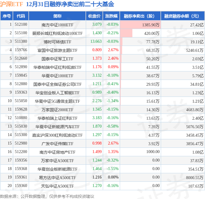 沪深ETF融券净卖出前三分别为:南方中证1000ETF(512100)融券净卖出1385.9万股、景顺长城红利低波动100ETF(515100)融券净卖出420万股、博时可转债ETF(511380)融券净卖出77.78万股,前20具体见下表: