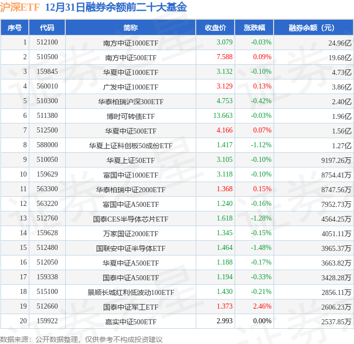 沪深ETF融券余额前三分别为:南方中证1000ETF(512100)融券余额24.96亿元、南方中证500ETF(510500)融券余额19.68亿元、华夏中证1000ETF(159845)融券余额4.73亿元,前20具体见下表: