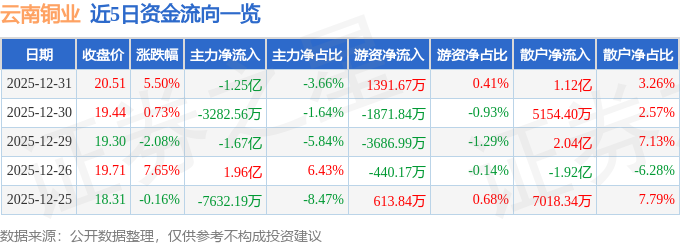 证券之星消息,截至2025年12月31日收盘,云南铜业(000878)报收于20.51元,上涨5.5%,换手率8.37%,成交量167.62万手,成交额34.24亿元。