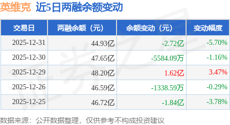 证券之星消息,12月31日,英维克(002837)融资买入7.3亿元,融资偿还9.92亿元,融资净卖出2.62亿元,融资余额44.72亿元,近20个交易日中有12个交易日出现融资净买入。