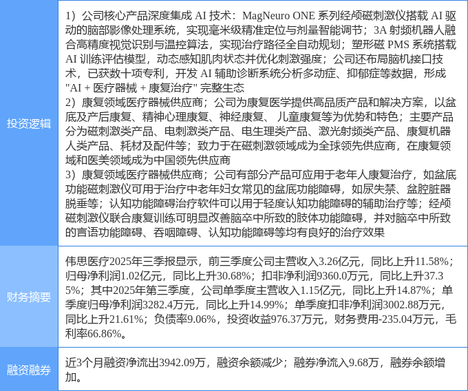证券之星消息,伟思医疗1月5日涨停收盘,收盘价58.08元。该股于9点52分涨停,2次打开涨停,截止收盘封单资金为155.39万元,占其流通市值0.03%。