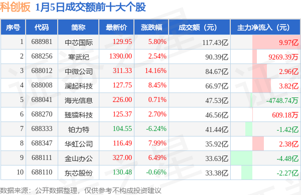 当日科创板成交额前10大个股中8只个股收涨,平均涨幅6.11%,其中中芯国际(688981)以成交额117.43亿元排第一。从主力资金流入看,成交额前10大个股中有6只个股呈现主力资金净流入。