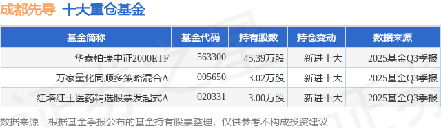 根据2025基金Q3季报公募基金重仓股数据,重仓该股的公募基金共3家,其中持有数量最多的公募基金为华泰柏瑞基金的华泰柏瑞中证2000ETF。华泰柏瑞中证2000ETF目前规模为21.68亿元,最新净值1.3659(12月31日),较上一交易日上涨0.0%,近一年上涨34.48%。该公募基金现任基金经理为柳军 李沐阳。柳军在任的基金产品包括:华泰柏瑞上证红利ETF,管理时间为2009年6月4日至今,期间收益率为140.13%;华泰柏瑞沪深300ETF,管理时间为2012年5月4日至今,期间收益率为116.02%;华泰柏瑞沪深300ETF联接A,管理时间为2012年5月29日至今,期间收益率为132.63%;华泰MSCI中国A股国际通ETF,管理时间为2018年4月26日至今,期间收益率为83.39%。李沐阳在任的基金产品包括:华泰柏瑞中证光伏产业ETF,管理时间为2021年1月6日至今,期间收益率为-19.78%;华泰柏瑞光伏ETF联接A,管理时间为2021年8月17日至今,期间收益率为-40.85%;华泰柏瑞中韩半导体ETF(QDII),管理时间为2022年11月2日至今,期间收益率为153.83%;华泰柏瑞纳斯达克100ETF(QDII),管理时间为2023年3月1日至今,期间收益率为105.97%。