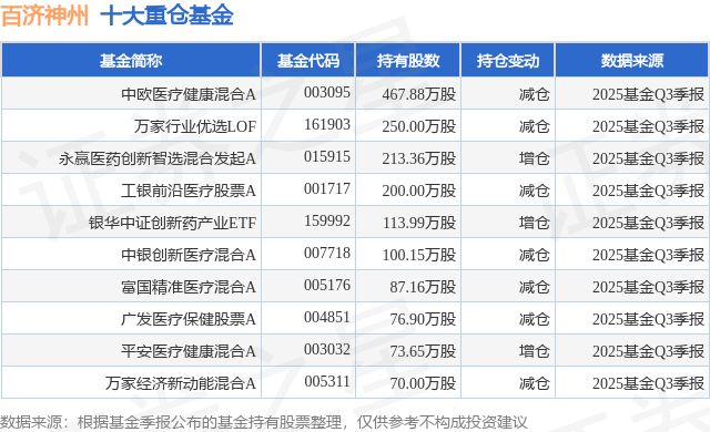 根据2025基金Q3季报公募基金重仓股数据,重仓该股的公募基金共155家,其中持有数量最多的公募基金为中欧基金的中欧医疗健康混合A。中欧医疗健康混合A目前规模为169.77亿元,最新净值1.7737(12月31日),较上一交易日下跌0.47%,近一年上涨13.07%。该公募基金现任基金经理为葛兰 赵磊。葛兰在任的基金产品包括:中欧明睿新起点混合,管理时间为2018年7月12日至今,期间收益率为86.46%;中欧医疗创新股票A,管理时间为2019年2月28日至今,期间收益率为43.82%。赵磊在任的基金产品包括:中欧医药生物混合发起A,管理时间为2025年11月26日至今,期间收益率为-2.45%。