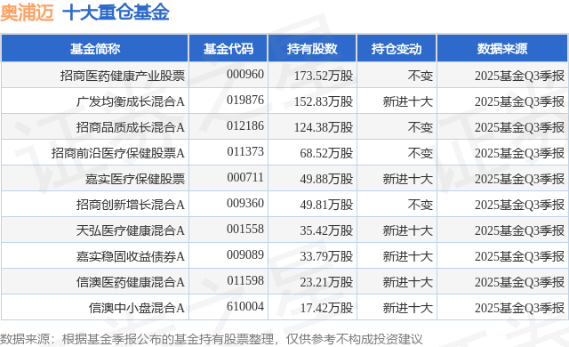 根据2025基金Q3季报公募基金重仓股数据,重仓该股的公募基金共20家,其中持有数量最多的公募基金为招商基金的招商医药健康产业股票。招商医药健康产业股票目前规模为13.86亿元,最新净值1.814(12月31日),较上一交易日上涨0.11%,近一年上涨15.91%。该公募基金现任基金经理为李佳存。李佳存在任的基金产品包括:招商创新增长混合A,管理时间为2020年6月17日至今,期间收益率为-20.89%;招商前沿医疗保健股票A,管理时间为2021年6月22日至今,期间收益率为-42.13%;招商品质成长混合A,管理时间为2021年9月23日至今,期间收益率为-23.57%。