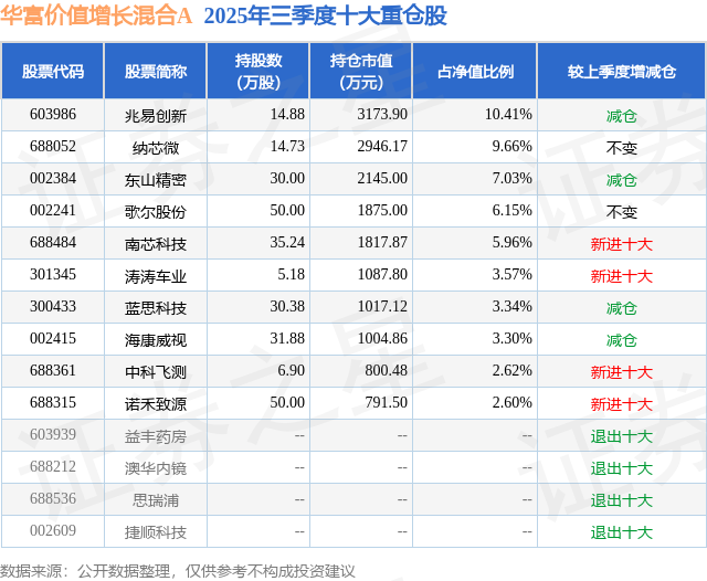 根据2025基金Q3季报公募基金重仓股数据,重仓该股的公募基金共1家,其中持有数量最多的公募基金为华富基金的华富价值增长混合A。华富价值增长混合A目前规模为3.01亿元,最新净值2.6985(12月31日),较上一交易日下跌0.66%,近一年上涨31.07%。该公募基金现任基金经理为陈启明。陈启明在任的基金产品包括:华富成长趋势混合A,管理时间为2017年3月14日至今,期间收益率为107.81%;华富成长企业精选股票A,管理时间为2020年6月18日至今,期间收益率为23.23%;华富卓越成长一年持有期混合A,管理时间为2022年1月13日至今,期间收益率为-2.99%。