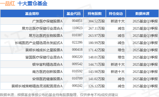 根据2025基金Q3季报公募基金重仓股数据,重仓该股的公募基金共44家,其中持有数量最多的公募基金为广发基金的广发医疗保健股票A。广发医疗保健股票A目前规模为51.85亿元,最新净值1.755(12月31日),较上一交易日下跌0.31%,近一年上涨8.57%。该公募基金现任基金经理为吴兴武。吴兴武在任的基金产品包括:广发轮动配置混合,管理时间为2015年2月12日至今,期间收益率为81.59%;广发医药健康混合A,管理时间为2020年10月21日至今,期间收益率为-44.16%;广发创新医疗两年持有混合A,管理时间为2021年3月19日至今,期间收益率为-27.0%。