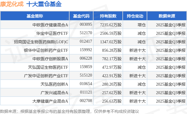 重仓康龙化成的前十大公募基金请见下表: