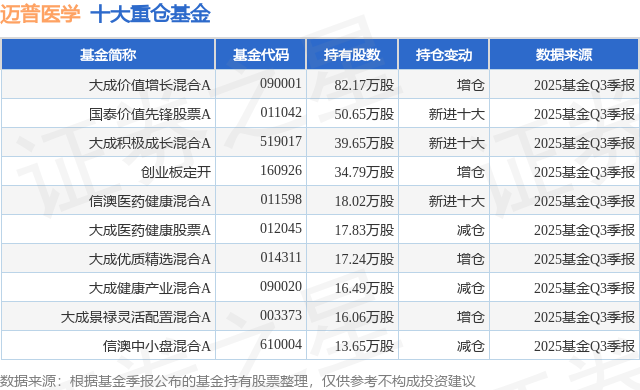 根据2025基金Q3季报公募基金重仓股数据,重仓该股的公募基金共18家,其中持有数量最多的公募基金为大成基金的大成价值增长混合A。大成价值增长混合A目前规模为10.63亿元,最新净值0.7882(12月31日),较上一交易日下跌0.82%,近一年上涨16.05%。该公募基金现任基金经理为杨挺。杨挺在任的基金产品包括:大成健康产业混合A,管理时间为2014年6月26日至今,期间收益率为27.39%;大成医药健康股票A,管理时间为2021年9月16日至今,期间收益率为-36.45%。