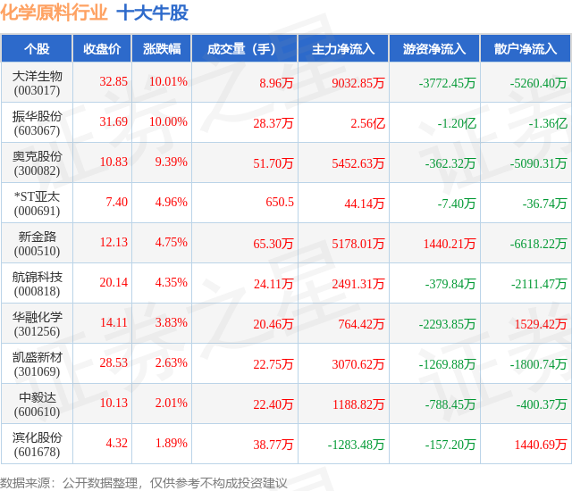 个股表现方面,化学原料行业当日领涨股为大洋生物(003017),该股当日报收32.85,上涨10.01%,成交量8.96万,主力资金净流入9032.85万元。振华股份(603067)以上涨10.0%紧随其后,该股当日成交量28.37万,主力资金净流入2.56亿元。除此之外,奥克股份(300082)、*ST亚太(000691)、新金路(000510)均进入当日牛股之列。具体个股列表见下表: