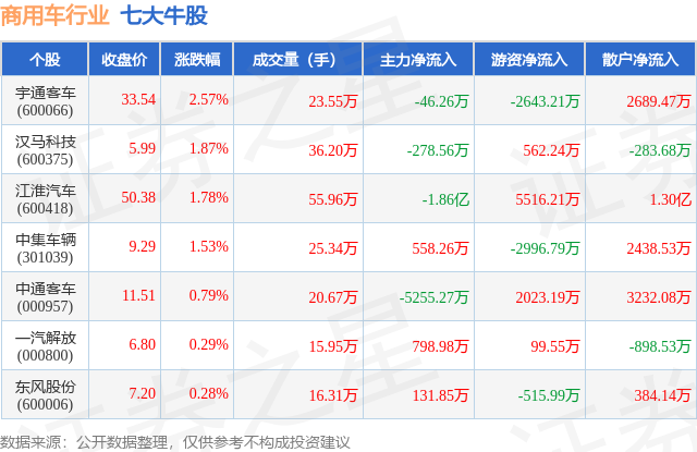 个股表现方面,商用车行业当日领涨股为宇通客车(600066),该股当日报收33.54,上涨2.57%,成交量23.55万,主力资金净流出46.26万元。汉马科技(600375)以上涨1.87%紧随其后,该股当日成交量36.2万,主力资金净流出278.56万元。除此之外,江淮汽车(600418)、中集车辆(301039)、中通客车(000957)均进入当日牛股之列。具体个股列表见下表: