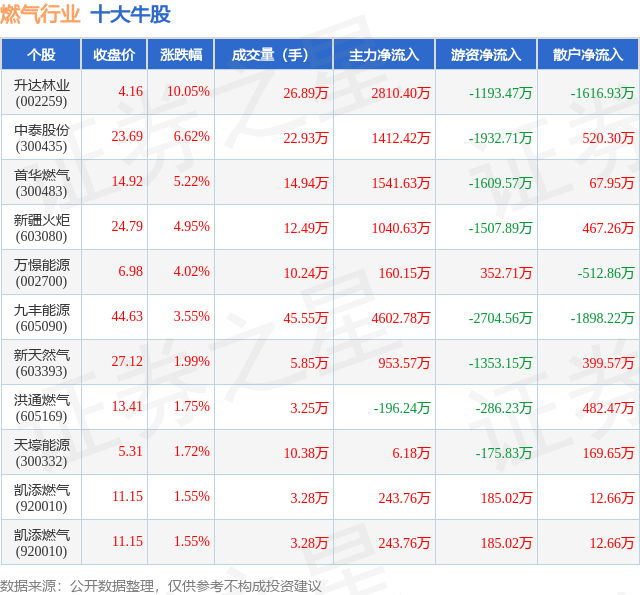 个股表现方面,燃气行业当日领涨股为升达林业(002259),该股当日报收4.16,上涨10.05%,成交量26.89万,主力资金净流入2810.4万元。中泰股份(300435)以上涨6.62%紧随其后,该股当日成交量22.93万,主力资金净流入1412.42万元。除此之外,首华燃气(300483)、新疆火炬(603080)、万憬能源(002700)均进入当日牛股之列。具体个股列表见下表: