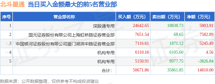 证券之星消息,沪深交易所2026年1月5日公布的交易公开信息显示,北斗星通(002151)因日涨幅偏离值达到7%的前5只证券登上龙虎榜。此次是近5个交易日内第3次上榜。