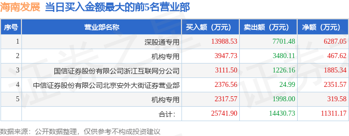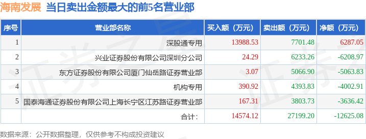 证券之星消息,沪深交易所2026年1月5日公布的交易公开信息显示,海南发展(002163)因日跌幅偏离值达到7%的前5只证券登上龙虎榜。此次是近5个交易日内第2次上榜。