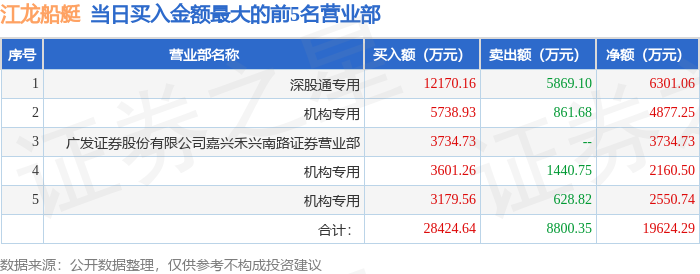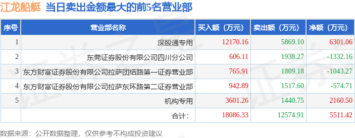 证券之星消息,沪深交易所2026年1月5日公布的交易公开信息显示,江龙船艇(300589)因日换手率达到30%的前5只证券登上龙虎榜。此次是近5个交易日内第1次上榜。